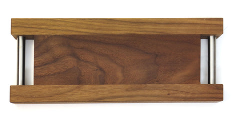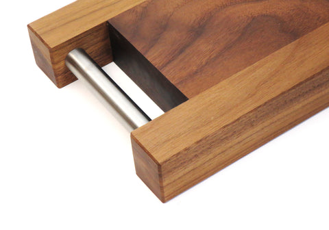 The Kate Duncan cutting board / serving tray / charcuterie plates are built like a cutting board but designed as a serving tray. With stainless steel handles inset into solid hardwood this piece is both functional in the kitchen and stunning in your home. Sleek and sturdy handles offer an easy way to move this piece from your kitchen counter, to the sink and dining table. Whether you’re preparing food in the kitchen or serving in the dining room this piece will accommodate a multitude of needs.